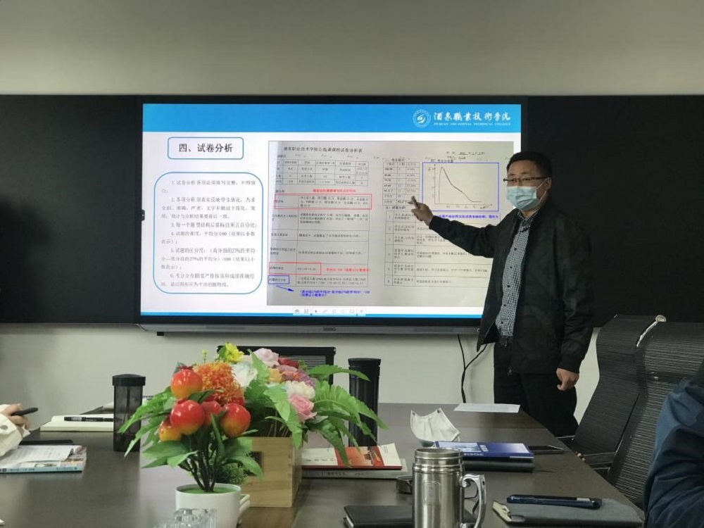 随后,教学副院长刘兴龙结合课程试卷考核与评价要求,以2021-2022学年第二学期期末试卷为例,详细介绍了期末考核中试卷准备、试卷批阅以及试卷分析要求,针对评卷规范、试卷装订顺序、考核资料等易错问题环节进行了规范,尤其是针对试卷分析中的试题难度、试题区分度、考分分布图等问题,与老师们进行了深入的探讨。活动现场气氛热烈,老师们纷纷表示,通过此次学习,对教学评价以及评价分析等方面有了更深入的理解,为进一步进行教学诊改明确了方向。