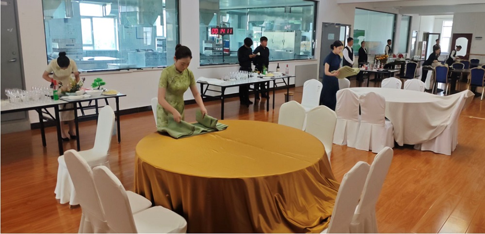 在中餐宴会区,学生团队围绕 “商务类”“家庭类”“政务类”主题,完成从宴会文案策划到宴会摆台、席间服务、分菜分汤、中心装饰物制作等全流程操作;西餐宴会区则凸显国际化服务规范,6人位餐桌布置融合台面主题设计、宴会摆台、席间服务、创意鸡尾酒调制、红酒侍酒等环节,每一步均参照酒店行业标准;前厅接待项目聚焦入住登记、礼宾及行李服务、中式铺床等岗位核心技能,充分体现 “以赛促学、以学促用” 的教学理念。