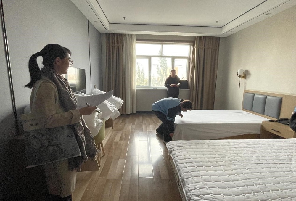 考核现场聚焦中式铺床实操项目,学生依次展示实践成果。考评组严格遵循行业标准与教学要求,从操作流程、成果质量、完成时间等多个核心维度进行量化评分,并结合现场表现给予针对性指导,助力学生及时发现问题、补齐技能短板。