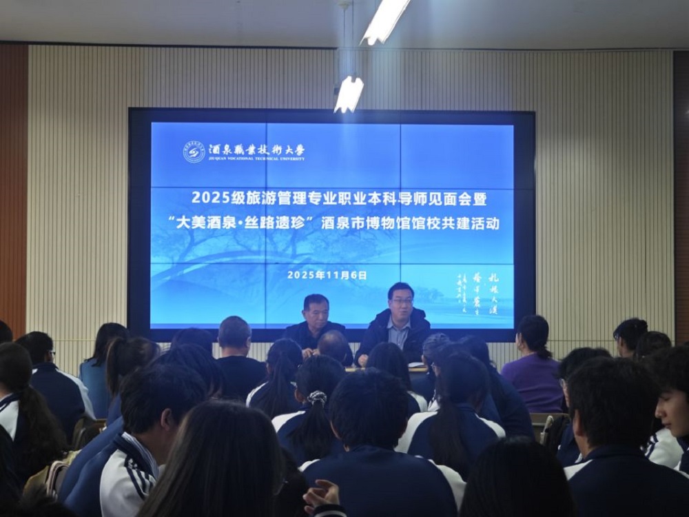 为深化职业本科人才培养模式改革,加强新生与导师的沟通,并依托地方文化资源,创新实践教学形式,提升学生的专业认同与实践能力。2025年11月6日,旅游与烹饪学院举办2025级旅游管理专业职业本科导师见面会暨“大美酒泉·丝路遗珍”馆校共建活动。会议由旅游与烹饪学院副院长董轩主持,党支部书记张来顺及全体旅游管理系教师参加。