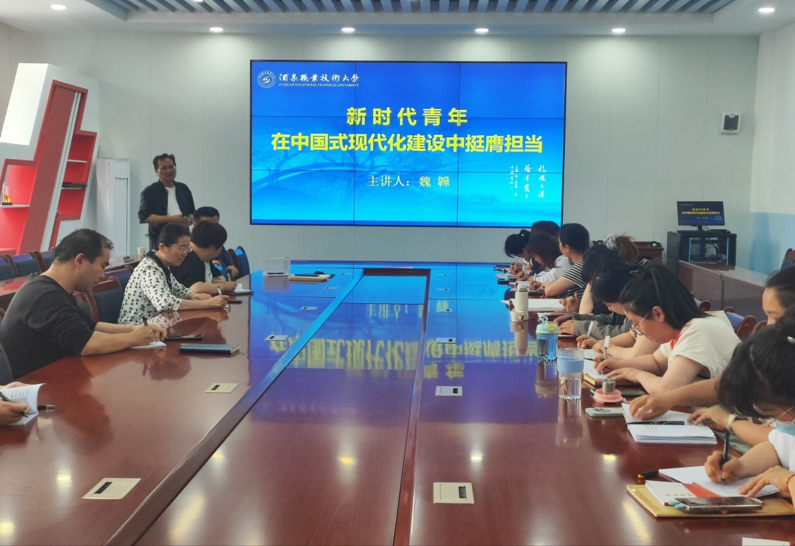 魏韡书记以习近平总书记最新讲话精神引出当代中国青年生逢其时,既迎来实现抱负的难得机遇,更肩负全面推进强国建设、民族复兴伟业的时代重任。引导医学院的青年教师,要弘扬永久奋斗的传统,立足本职岗位,勇于担当作为,为推动酒泉职业技术大学的发展贡献自己的力量。