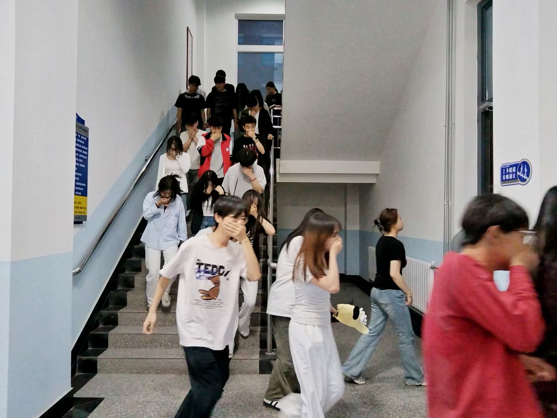按照既定演练方案第一阶段由班级组织开展应急逃生专题班会,学习应急技能,增强安全防护意识,强调演练安全和注意事项。2045分,随着应急疏散哨声的响起,全体学生在老师、安全员疏引下,按照演练线路,快速、有序地完成撤离。