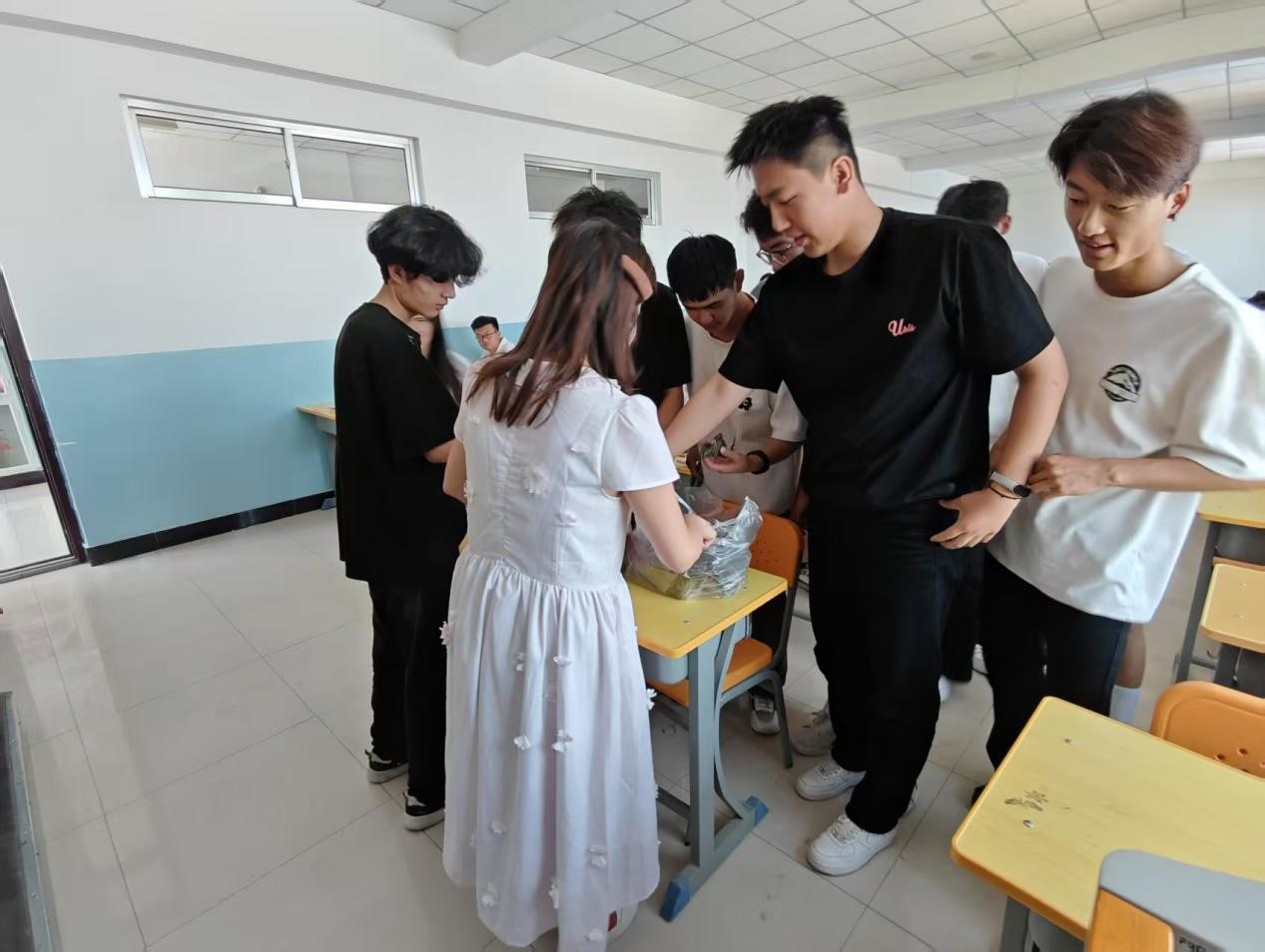 活动现场洋溢着浓厚的节日氛围。刘康丽老师精心准备了传统粽子,像春风化雨般将温暖传递给每位同学;香甜的粽子传递着师者如烛的关怀—以点滴付出照亮学生的成长之路。活动现场,刘老师不仅送上了真挚的端午祝福,还强调了安全注意事项,她提醒同学们要注意交通安全、饮食安全,同时要保持规律作息,做到劳逸结合。