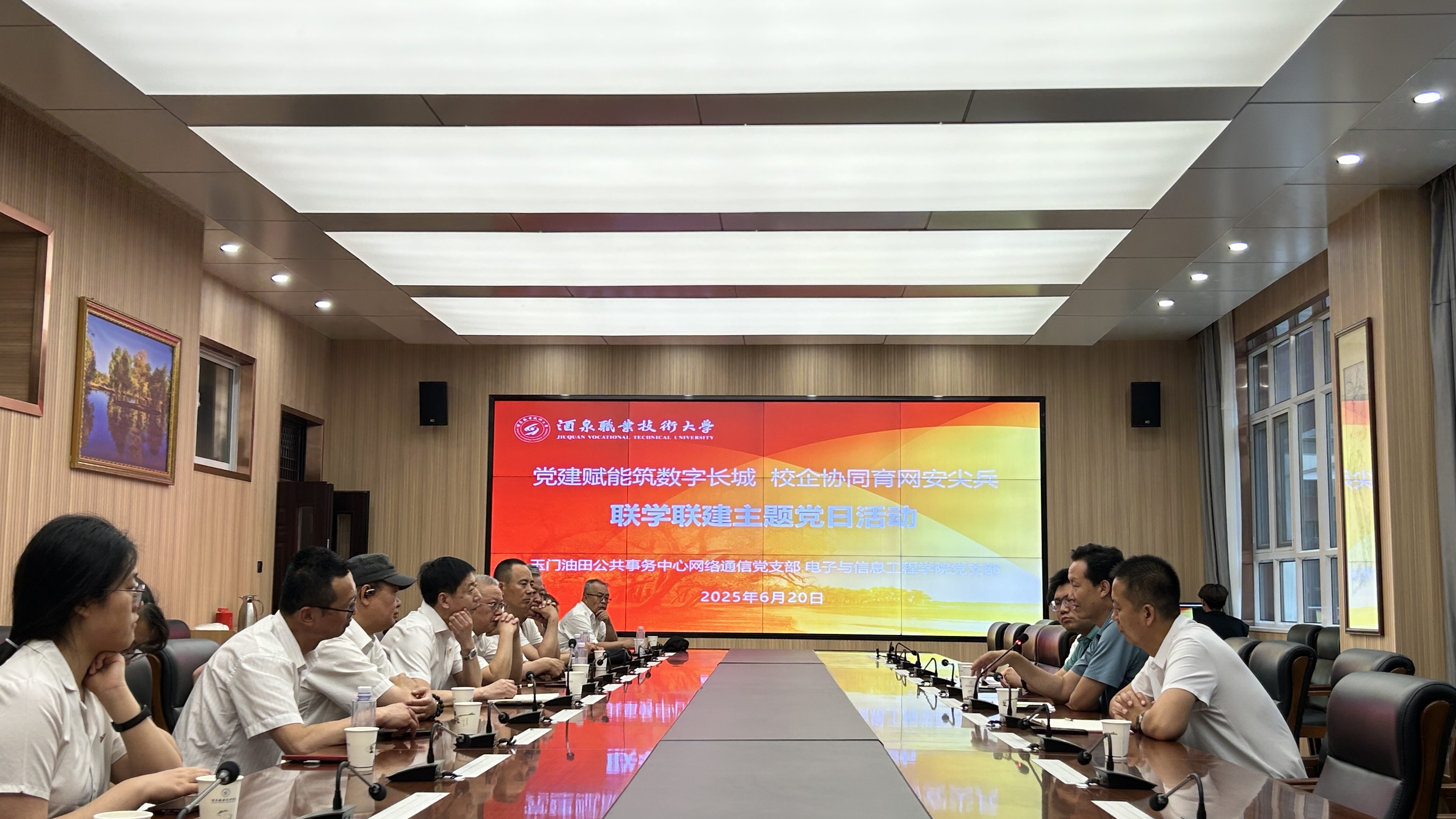 为深入学习贯彻习近平总书记关于网络强国的重要思想,推动党建与业务深度融合, 6月20日下午,酒泉职业技术大学电子与信息工程学院党支部联合玉门油田公共事务中心网络通信党支部,在我校共同开展了“党建赋能筑数字长城,校企协同育网安尖兵” 联学联建主题党日活动。