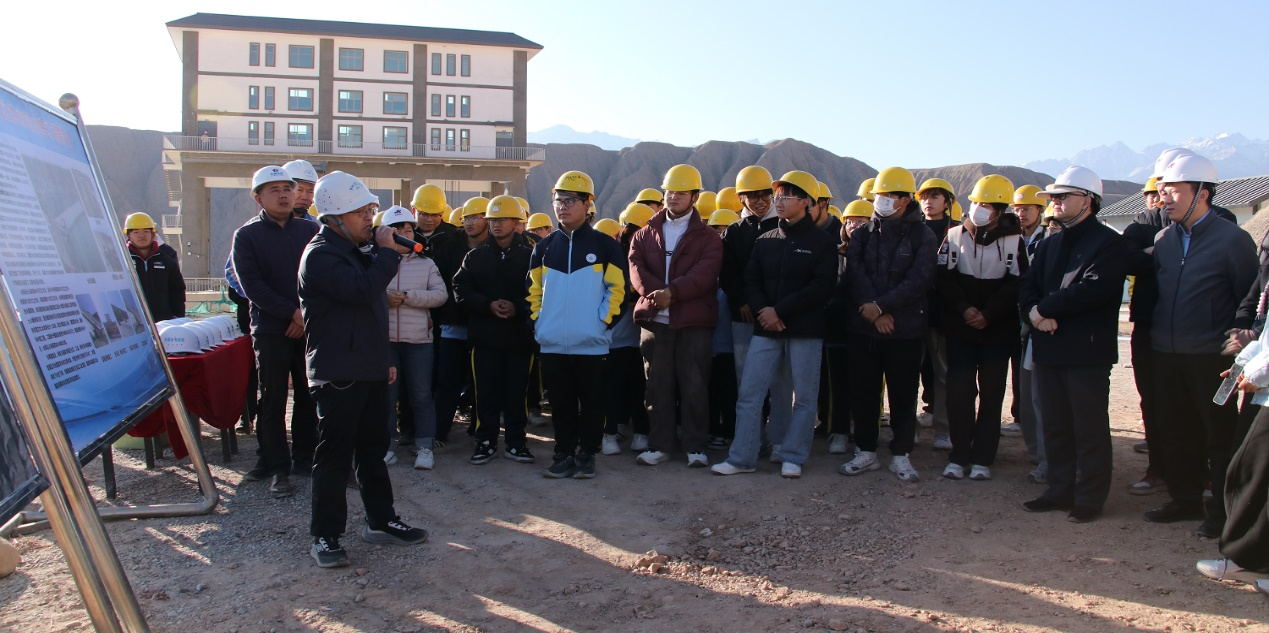 在工程现场,项目部各方负责人为师生呈现了一堂生动而深刻的“实景工程课”。李智高工首先阐述了洪水河水库在优化区域水资源配置、提升农业灌溉保障能力及维护酒泉市城市供水安全方面的重要功能,使学生深刻认识到水利工程在河西走廊干旱区水资源管理中的关键作用。随后,李文博所长结合水库日常运行实际,系统讲解了如何依据实时水位、气象预报等数据进行科学调度,以实现安全运行与综合效益最大化,展现了现代水利管理的精细化与智能化发展趋势。甘肃省水利水电勘察设计研究院项目负责人成会军则从洪水河的年径流特征、防洪标准及供水范围等设计基础入手,全面解析了水库的规划理念与设计创新,凸显了科技赋能水利建设的新方向。最后,中国水利水电第四工程局项目部负责人蔺尚杰聚焦大坝主体防渗与边坡加固等关键工程,介绍了相关施工工艺、流程及技术难点攻关过程,强化了学生对水利施工复杂性与技术要求的理解。