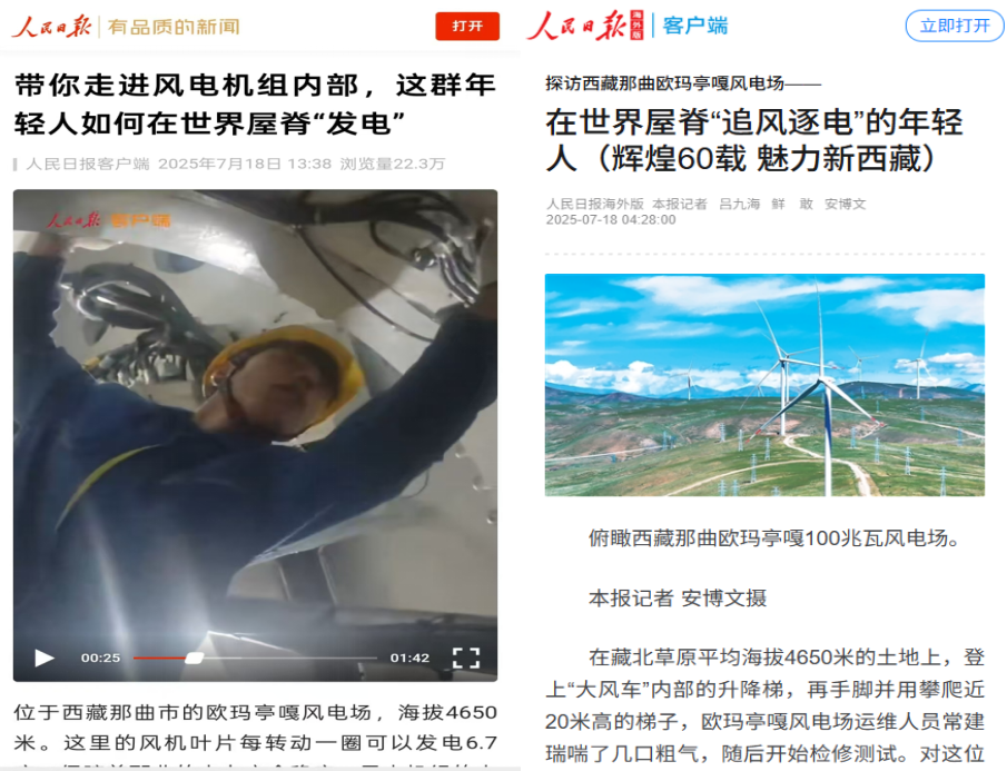 其扎根青藏高原、奉献绿色能源的事迹曾被人民日报以“带你走进风电机组内部,这群年轻人如何在世界屋脊发电”为题报道,展现了新时代职高毕业生积极响应国家援藏号召,投身于绿色能源发展事业,为国家低碳能源战略贡献力量的精神风貌。