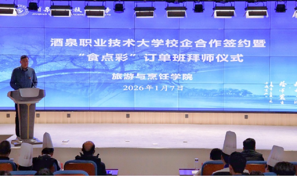 春潮涌动启新程,薪火相传育匠心。2026 年 1 月 7 日下 午,酒泉职业技术大学与深圳市食点彩食品餐饮有限公司校 企合作签约暨“食点彩”订单班拜师仪式在弘毅楼 C101 闻 道厅隆重举行。酒泉职业技术大学党委委员、副校长杨洁、 产教融合处处长赵平、教务处副处长郭志勇、深圳市食点彩 食品餐饮有限公司总经理孙伟民、企业导师谢海蓉出席了会 议,旅游与烹饪学院党支部副书记、院长刘兴龙主持了会议, 旅游与烹饪学院领导班子及烹饪工艺与营养系全体师生参 加了会议。