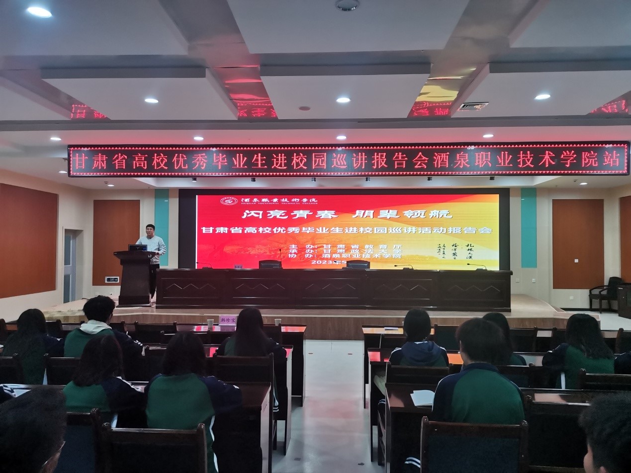 5月4日,由省教育厅主办、甘肃政法大学承办、酒泉职业技术学院协办的“闪亮青春 同辈领航”甘肃省高校优秀毕业生进校园巡回演讲报告会在图书馆四楼会议室举行,学校邀请牧兽医专业2011届秀毕业生李万金和2015届毕业生韩珍宝为学生作报告,350多名学生代表聆听报告。