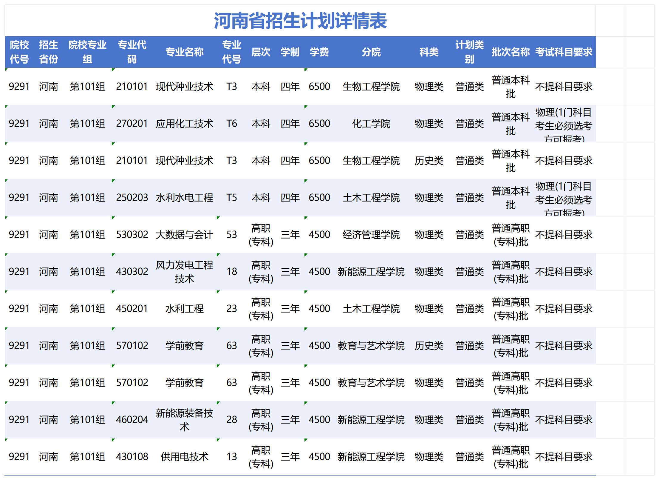 河南省招生计划详情表