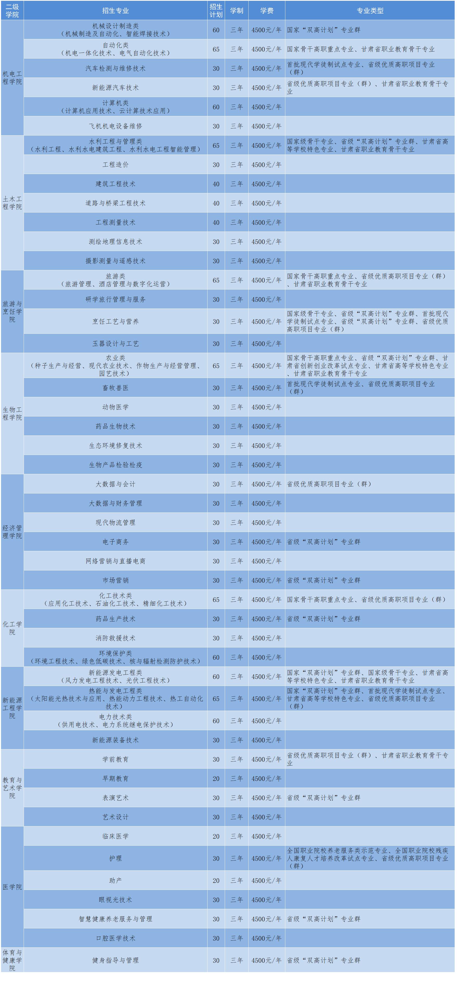 校园占地面积2128.67亩,校舍建筑面积43.82万平方米,教学仪器设备总值15775.84万元,图书212.68万册(含电子图书),拥有新能源等各类校内实训基地(中心)11个,实训室(实训车间)141个,固定资产5.69亿元。设有16个二级学院,教职工总人数644人,其中:专任教师576人,教授33人,副教授181人,博士9人,硕士286人,双师型教师346人。获评全国模范(优秀)教师2人;甘肃省园丁奖4人;甘肃省高校教学名师4人;甘肃省青年教师成才奖6人;首批国家级职业教育教师教学创新团队1个;甘肃省职业教育教师教学创新团队6个。现有在校生13734人,已累计培养各类人才10万余人,毕业生就业率稳定在96%以上。